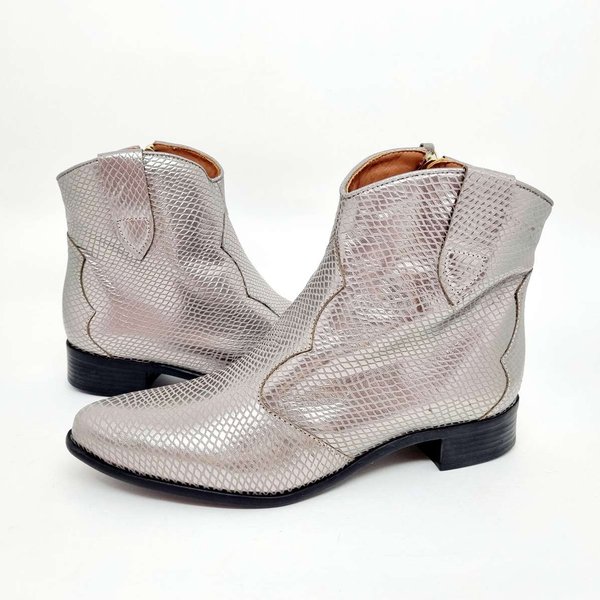 A Bota Western Metalizada Ferrucci é confeccionada em couro com acabamento metalizado, trazendo toda ousadia das tendências da estação, esse modelo na pegada "country" sem dúvidas vai atrair todos os olhares. Modelo baixo, com bico levemente fino e forração interna macia, trás o conforto que você busca. Possuí zíper interno para fechamento, seu solado é emborrachado.