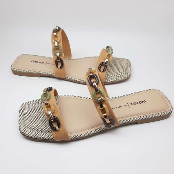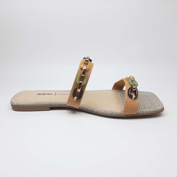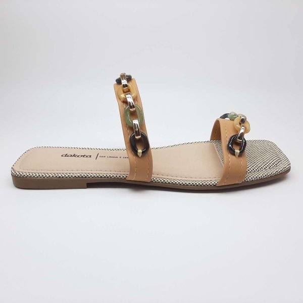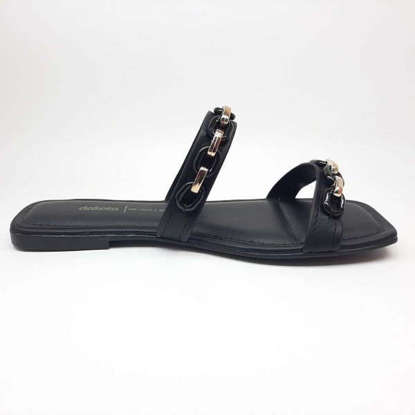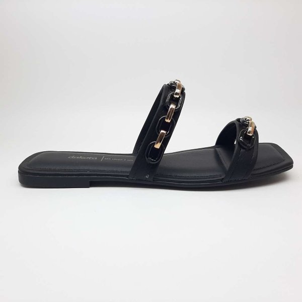 A Rasteira Com Aplique Feminina Dakota é confeccionada em material sintético, possui duas tiras estreitas com aplicação de corrente. Modelo que vai combinar com vários looks de verão, seja com vestidos, saias ou shorts. Sua palmilha é acolchoada e muito confortável, solado emborrachado.