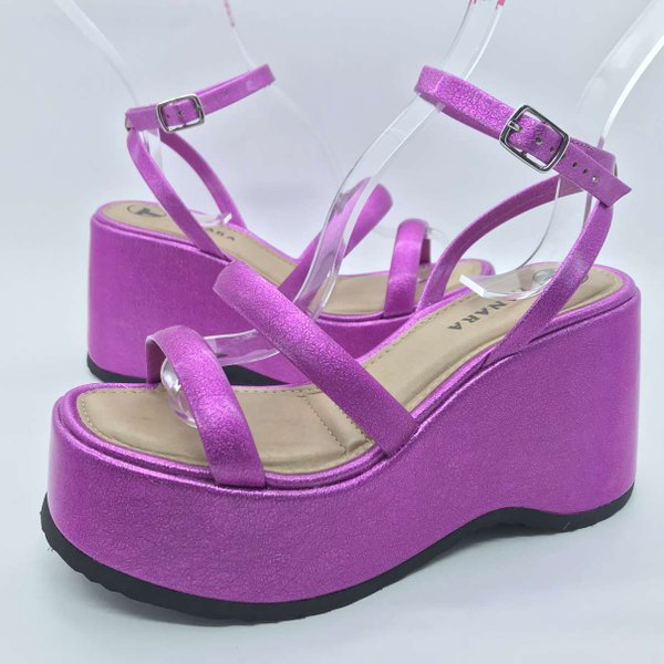 Sandália Anabela Feminina Tanara é confeccionada em sintético com acabamento metalizado, ela possui cabedal com duas tiras mais finas e seu fechamento é em fivela no tornozelo, calcanhar aberto. Bico com contorno levemente quadrado. Solado de borracha com antiderrapante, modelo plataforma, garantindo mais estilo e conforto.