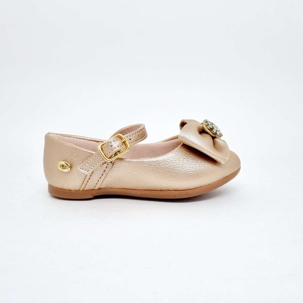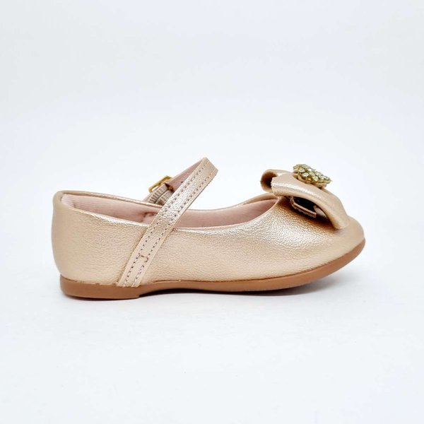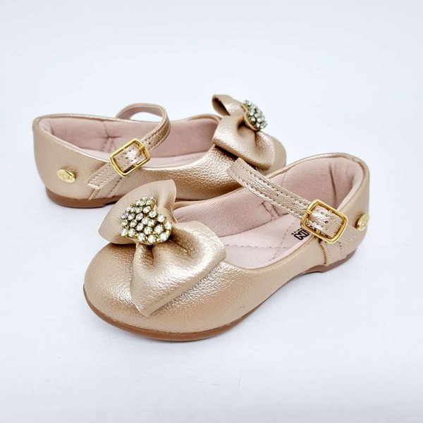 A Sapatilha Infantil Klin Princesa é confeccionada em material sintético com acabamento metalizado, forração interna em material têxtil macio, palmilha anatômica acolchoada, detalhe de laço com aplique de strass no cabedal, esse modelo vem com tira sob o peito do pé com fechamento por fivela ajustável, modelo dando maior segurança ao caminhar. Solado emborrachado. Modelo muito confortável para as crianças pelo forro possuir espuma, o que facilita a adaptação do pé ao calçado. Modelo clássico que ganha um ar romântico com o detalhe da fivela de coração, nesta cor ouro rosado fica bem com as mais diversas cores de vestidos e saias.